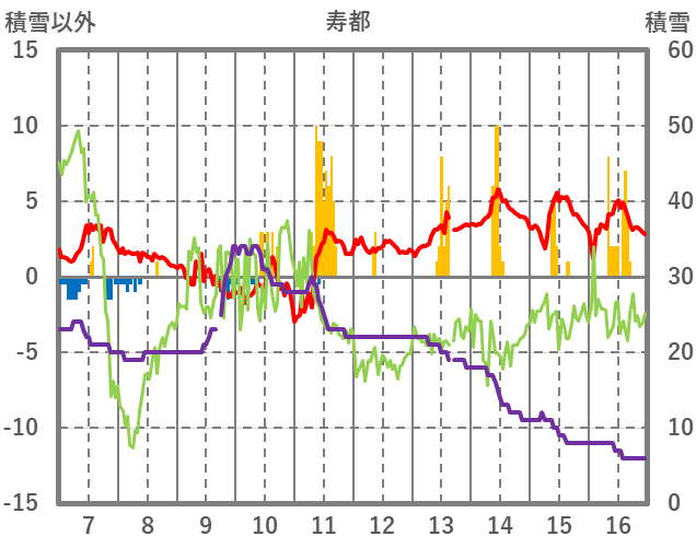 | 日 | 時 | 気温 | 降水 | 風向/風速 | 日照 | 積雪 | 降雪 |