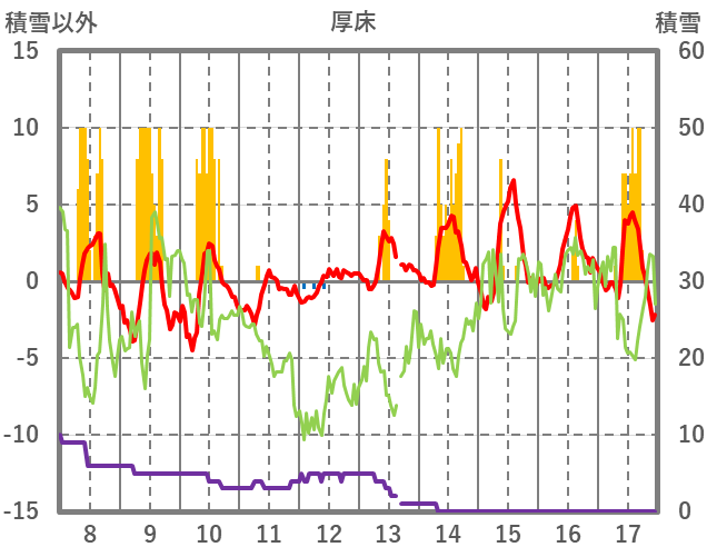 | 日 | 時 | 気温 | 降水 | 風向/風速 | 日照 | 積雪 | 降雪 |