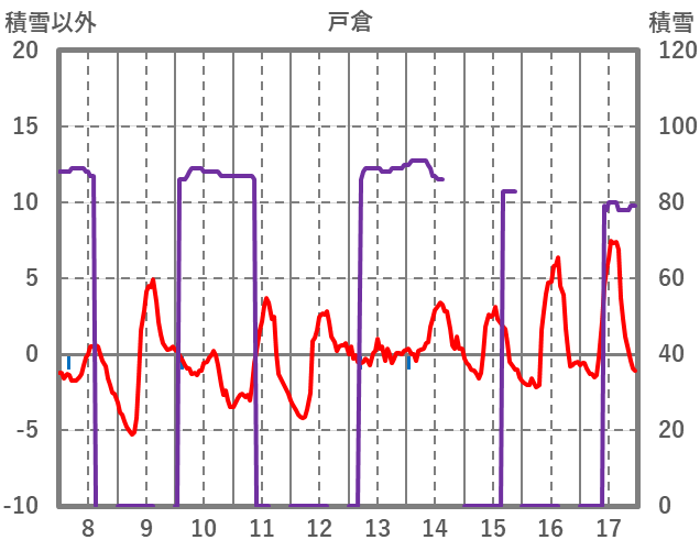 | 日 | 時 | 気温 | 降水 | 風向/風速 | 日照 | 積雪 | 降雪 |