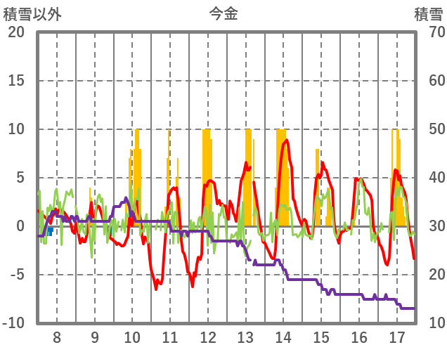 | 日 | 時 | 気温 | 降水 | 風向/風速 | 日照 | 積雪 | 降雪 |