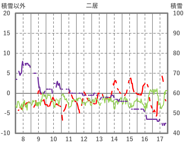 | 日 | 時 | 気温 | 降水 | 風向/風速 | 日照 | 積雪 | 降雪 |