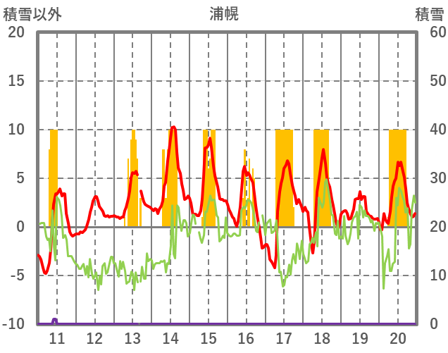 | 日 | 時 | 気温 | 降水 | 風向/風速 | 日照 | 積雪 | 降雪 |