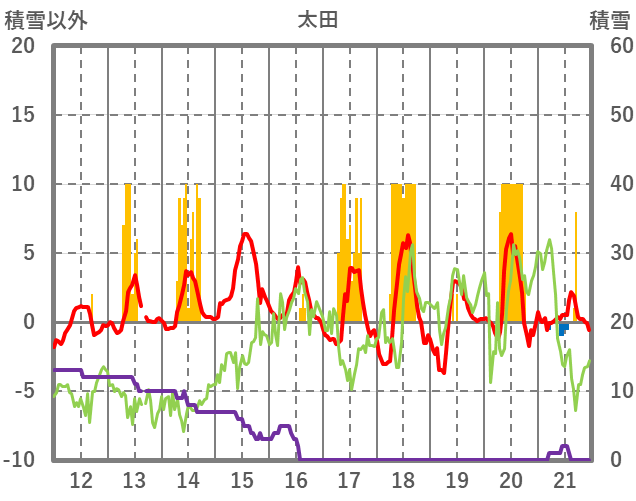 | 日 | 時 | 気温 | 降水 | 風向/風速 | 日照 | 積雪 | 降雪 |