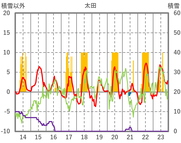 | 日 | 時 | 気温 | 降水 | 風向/風速 | 日照 | 積雪 | 降雪 |